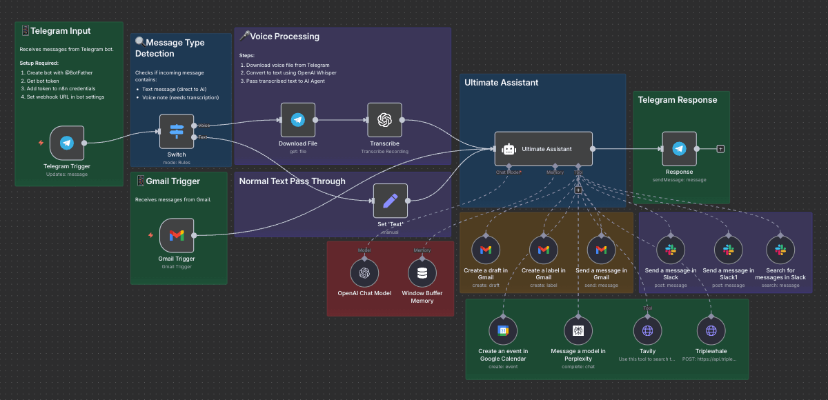 Combines voice, information, and communication inputs, processes them using AI, and automates responses across Gmail, Slack, and Telegram—your total productivity assistant.